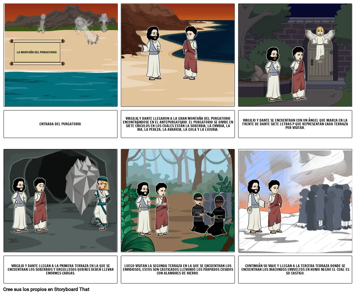 VIRGILIO Y DANTE LLEGARON A LA GRAN MONTAÑA DEL PURGATORIO ENCONTRÁNDOSE EN EL ANTEPURGATORIO. EL PURGATORIO SE DIVIDE EN SIETE CÍRCULOS EN LOS CUALES ESTÁN LA SOBERBIA, LA ENVIDIA, LA IRA, LA PEREZA, LA AVARICIA, LA GULA Y LA LUJURIA.