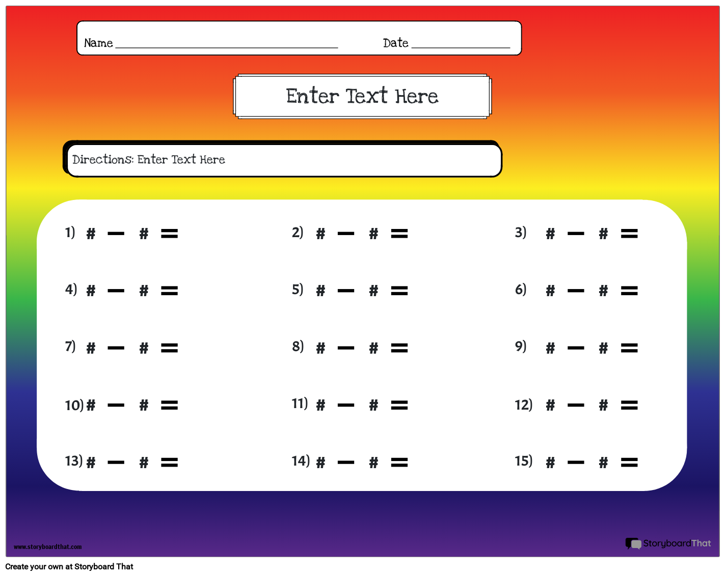 इंद्रधनुष थीम्ड घटाव कार्यपत्रक। 15 समस्याओं के साथ लैंडस्केप।