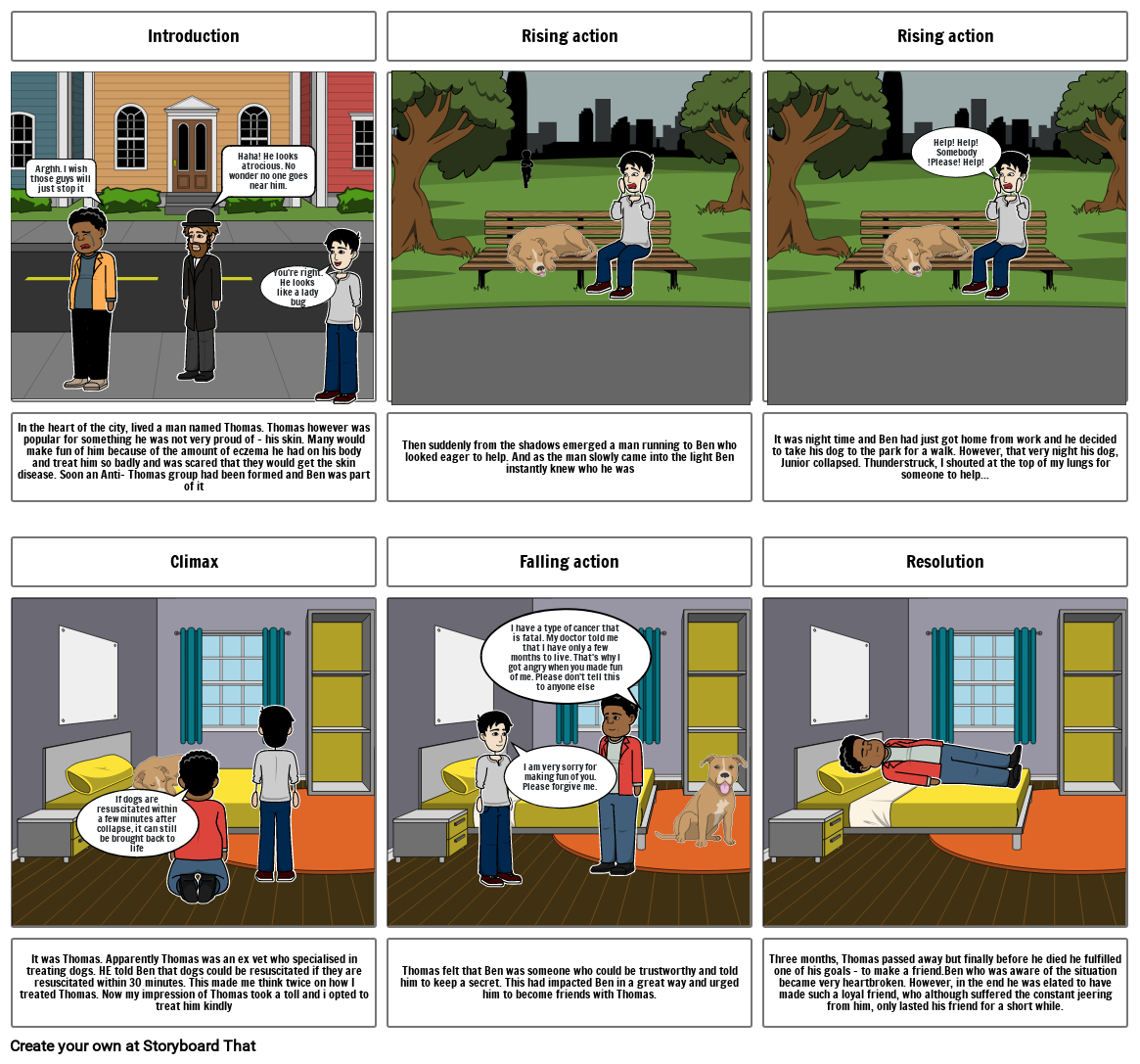 In the heart of the city, lived a man named Thomas. Thomas however was popular for something he was not very proud of - his skin. Many would make fun of him because of the amount of eczema he had on his body and treat him so badly and was scared that they would get the skin disease. Soon an Anti- Thomas group had been formed and Ben was part of it