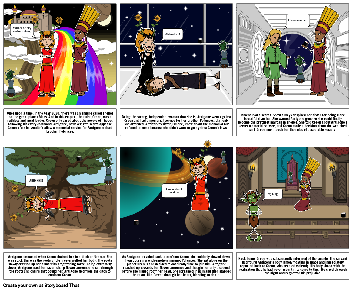 Once upon a time, in the year 3030, there was an empire called Thebes on the great planet Mars. And in this empire, the ruler, Creon, was a ruthless and rigid leader. Creon only cared about the people of Thebes following his every command. Antigone, however, refused to appease Creon after he wouldn't allow a memorial service for Antigone's dead brother, Polynices.