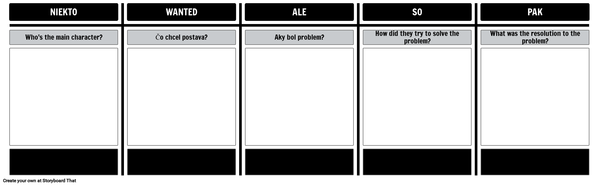 Niekto chcel, ale potom - Šablóna pre 5 buniek T Chart pre analýzu príbehov pomocou nástroja Storyboard That