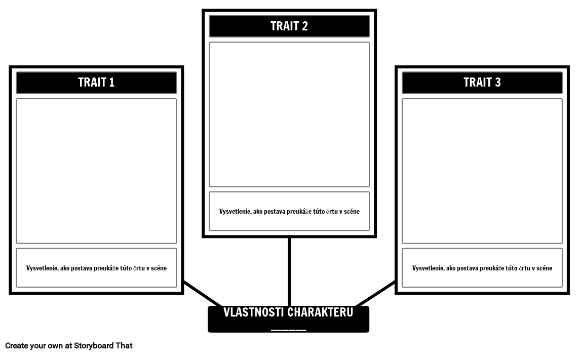 Šablóna znakových znakov na mape pavúka. Identifikujte tri znakové črty a zobrazte ich v storyboarde.