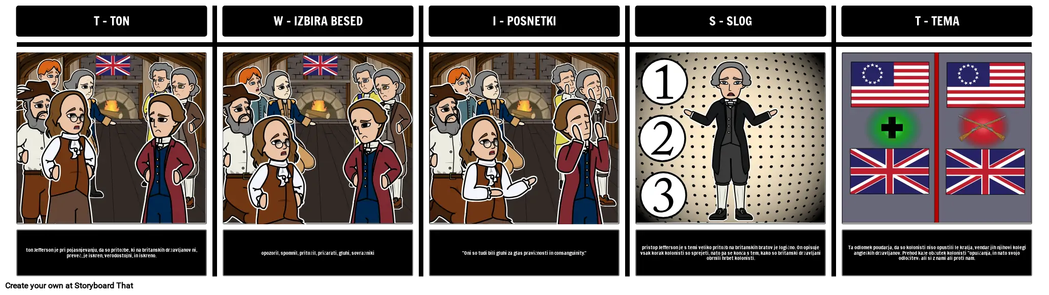 Izvedite analizo TWIST z izborom iz deklaracije o neodvisnosti. Ne pozabite, da TWIST predstavlja Tone, Word Choice, posnetki, Style, tema.