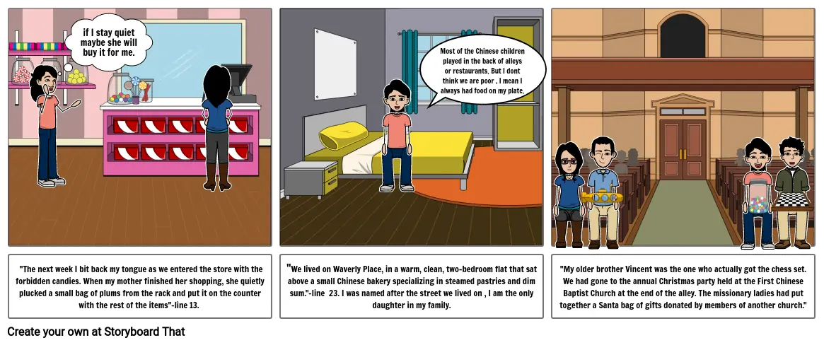 "We lived on Waverly Place, in a warm, clean, two-bedroom flat that sat above a small Chinese bakery specializing in steamed pastries and dim sum."-line 23. I was named after the street we lived on , I am the only daughter in my family.
