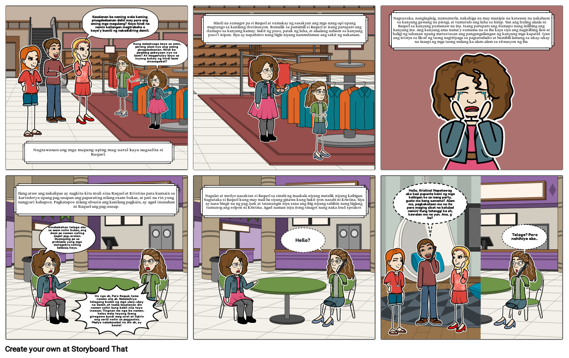 Oo nga eh. Pero Raquel, tama naman sila eh. Nakakahiya talagang bumili ng mga ukay-ukay na damit, at tsaka kasalanan din naman natin kung bakit nila tayo inaasar. Tingnan mo nga ba naman, halos wala tayong ibang ginagawa kundi mag-aral at tipirin ang sarili natin sa paggastos. Medyo nakakasakal na din eh, ay basta!