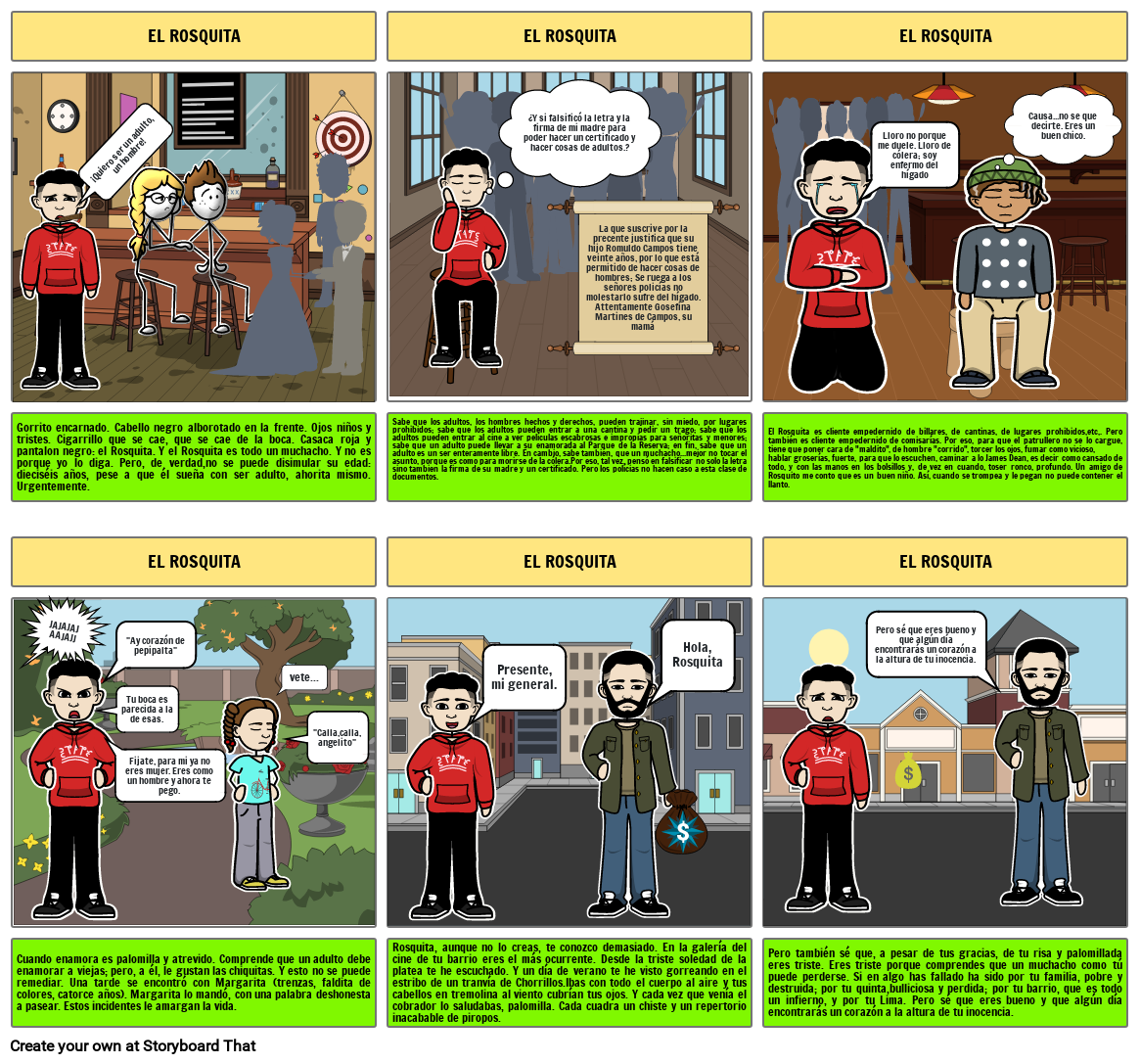 Gorrito encarnado. Cabello negro alborotado en la frente. Ojos niños y tristes. Cigarrillo que se cae, que se cae de la boca. Casaca roja y pantalon negro: el Rosquita. Y el Rosquita es todo un muchacho. Y no es porque yo lo diga. Pero, de verdad,no se puede disimular su edad: dieciséis años, pese a que él sueña con ser adulto, ahorita mismo. Urgentemente.
