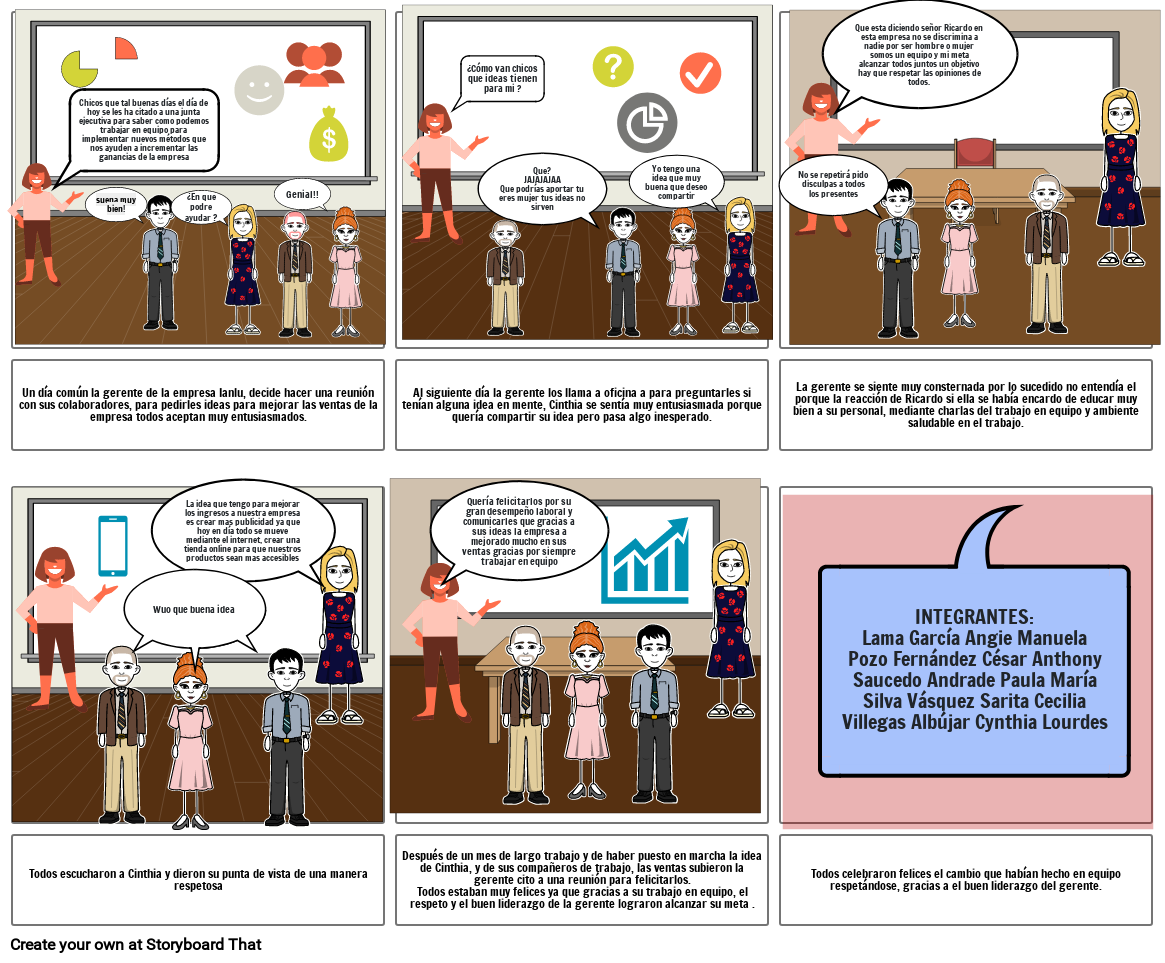 Después de un mes de largo trabajo y de haber puesto en marcha la idea de Cinthia, y de sus compañeros de trabajo, las ventas subieron la gerente cito a una reunión para felicitarlos. Todos estaban muy felices ya que gracias a su trabajo en equipo, el respeto y el buen liderazgo de la gerente lograron alcanzar su meta .
