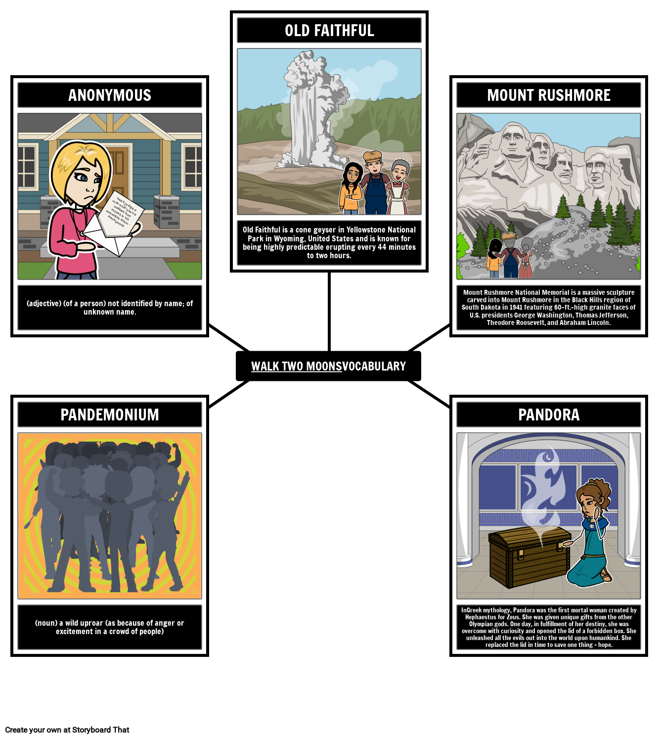يساعد بدء وحدة أو درس باستخدام المفردات الأساسية في الاستيعاب والاحتفاظ بشكل عام. في هذا النشاط ، سيقوم الطلاب بإنشاء لوحة عمل تحدد وتوضح المفردات الموجودة في كتاب Walk Two Moons من تأليف شارون كريش. سيقوم الطلاب بإنشاء خريطة عنكبوتية من 3-5 فصول وفقًا لتقدير المعلمين. ستحتوي كل خلية على مصطلح أو إشارة ، وتعريفها أو وصفها ، وتوضيح مناسب.
