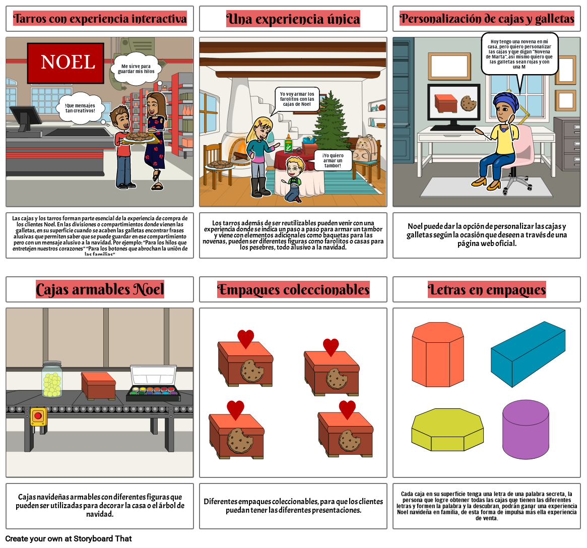 Las cajas y los tarros forman parte esencial de la experiencia de compra de los clientes Noel. En las divisiones o compartimientos donde vienen las galletas, en su superficie cuando se acaben las galletas encontrar frases alusivas que permiten saber que se puede guardar en ese compartimiento pero con un mensaje alusivo a la navidad. Por ejemplo: “Para los hilos que entretejen nuestros corazones” “Para los botones que abrochan la unión de las familias”