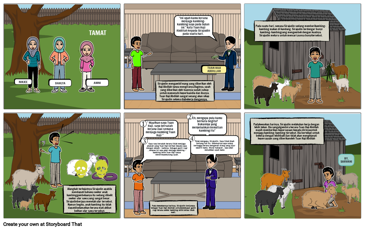Saya rasa bersalah kerana tidak menjaga amanah yang Tuan Haji berikan kepada saya dengan sebaik - baiknya. Sebagai ganti rugi , selepas ini saya akan menjaga kambing - kambing milik Tuan Haji tanpa menerimasebarang upah.