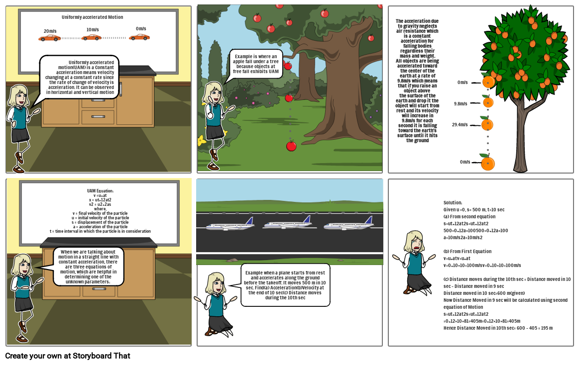 UAM Equation:v =u+atx = ut+12at2v2 = u2+2aswhere,v = final velocity of the particleu = initial velocity of the particles = displacement of the particlea = acceleration of the particlet = time interval in which the particle is in consideration