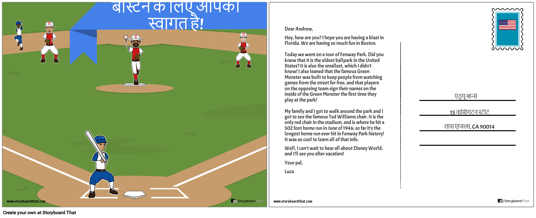 Dear Andrew, Hey, how are you? I hope you are having a blast in Florida. We are having so much fun in Boston. Today we went on a tour of Fenway Park. Did you know that it is the oldest ballpark in the United States? It is also the smallest, which I didn't know! I also leaned that the famous Green Monster was built to keep people from watching games from the street for free, and that players on the opposing team sign their names on the inside of the Green Monster the first time they play at the park! My family and I got to walk around the park and I got to see the famous Ted Williams chair. It is the only red chair in the stadium, and is where he hit a 502 foot home run in June of 1946; so far it's the longest home run ever hit in Fenway Park history! It was so cool to learn all of that info. Well, I can't wait to hear all about Disney World, and I'll see you after vacation! Your pal, Luca