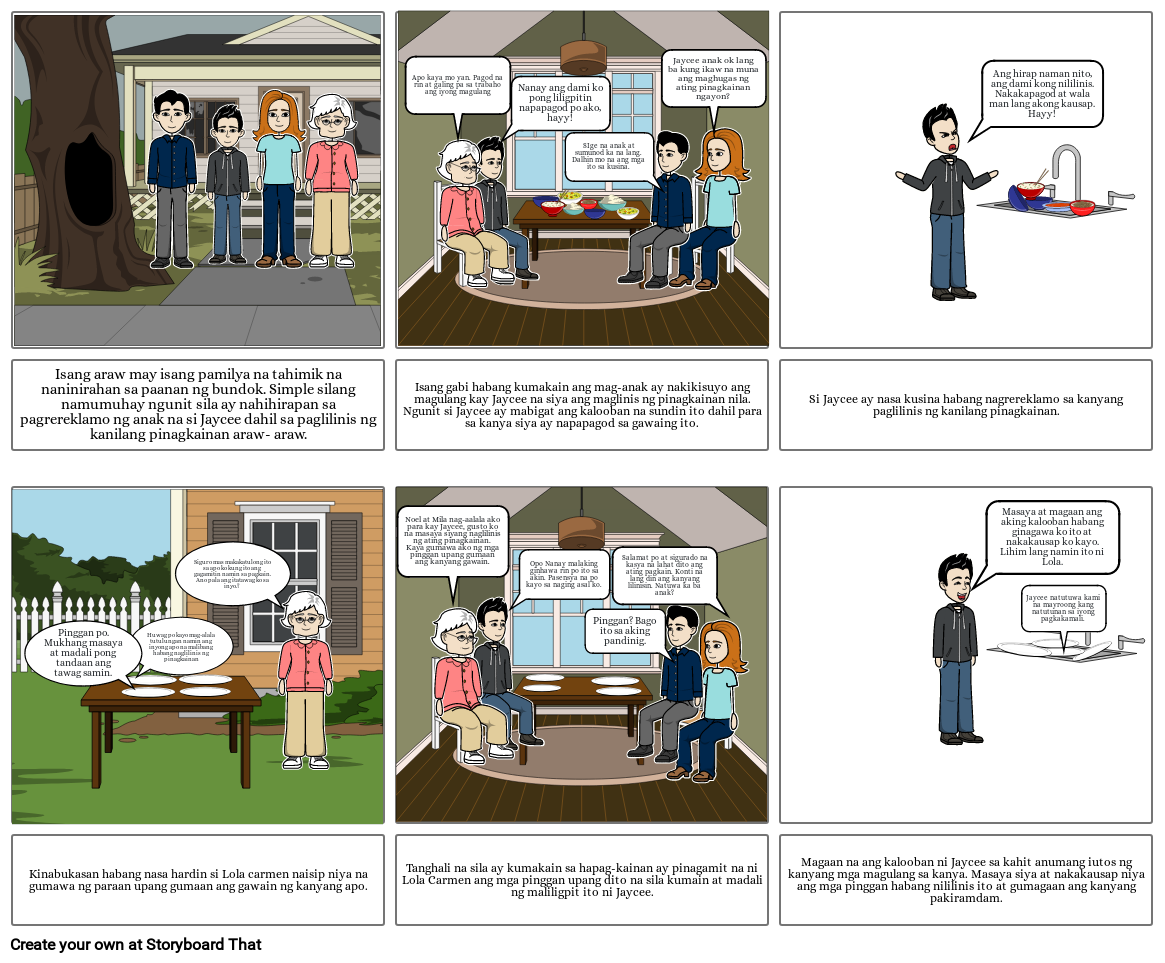 Isang gabi habang kumakain ang mag-anak ay nakikisuyo ang magulang kay Jaycee na siya ang maglinis ng pinagkainan nila. Ngunit si Jaycee ay mabigat ang kalooban na sundin ito dahil para sa kanya siya ay napapagod sa gawaing ito.