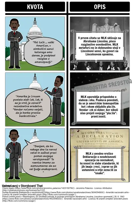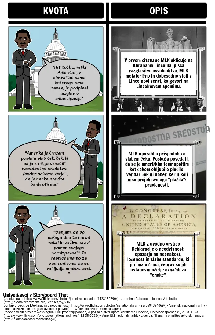 V prvem citatu se MLK sklicuje na Abrahama Lincolna, pisca razglasitve osvoboditve. MLK metaforično in dobesedno stoji v Lincolnovi senci, ko govori na Lincolnovem spominu.