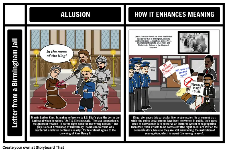 Martin Luther King, Jr. makes reference to T.S. Eliot's play Murder in the Cathedral when he writes: “As T.S. Eliot has said: ‘The last temptation is the greatest treason: To do the right deed for the wrong reason.’” The play is about Archbishop of Canterbury Thomas Becket who was murdered, and later declared a martyr, for his refusal agree to the crowning of King Henry II.