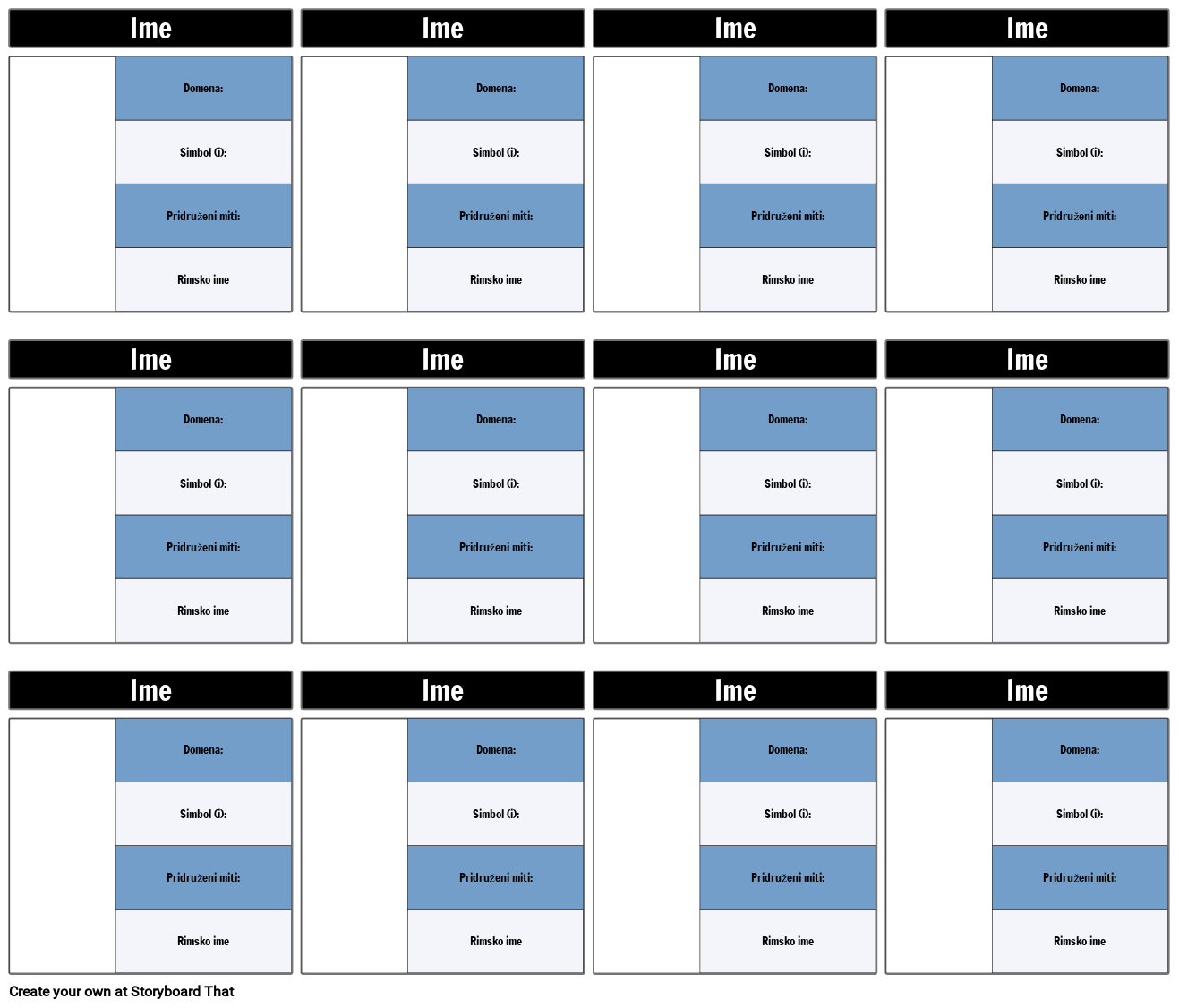 Predloga karte znakov za grške bogove in boginje. Polja vključujejo domeno, simbol, povezane mite in rimsko ime.