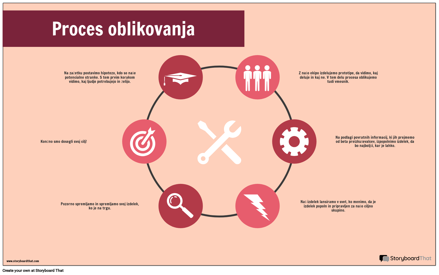 Na začetku postavimo hipotezo, kdo so naše potencialne stranke. S tem prvim korakom vidimo, kaj ljudje potrebujejo in želijo. Končno smo dosegli svoj cilj! Pozorno spremljamo in spremljamo svoj izdelek, ko je na trgu. Z našo ekipo izdelujemo prototipe, da vidimo, kaj deluje in kaj ne. V tem delu procesa oblikujemo tudi vmesnik. Na podlagi povratnih informacij, ki jih prejmemo od beta preizkuševalcev, izpopolnimo izdelek, da bo najboljši, kar je lahko. Naš izdelek lansiramo v svet, ko menimo, da je izdelek popoln in pripravljen za našo ciljno skupino.