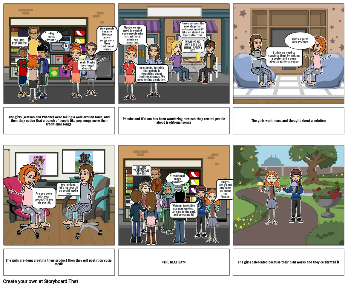 The girls (Watson and Pheobe) were taking a walk around town, And then they notice that a bunch of people like pop songs more than traditional songs.