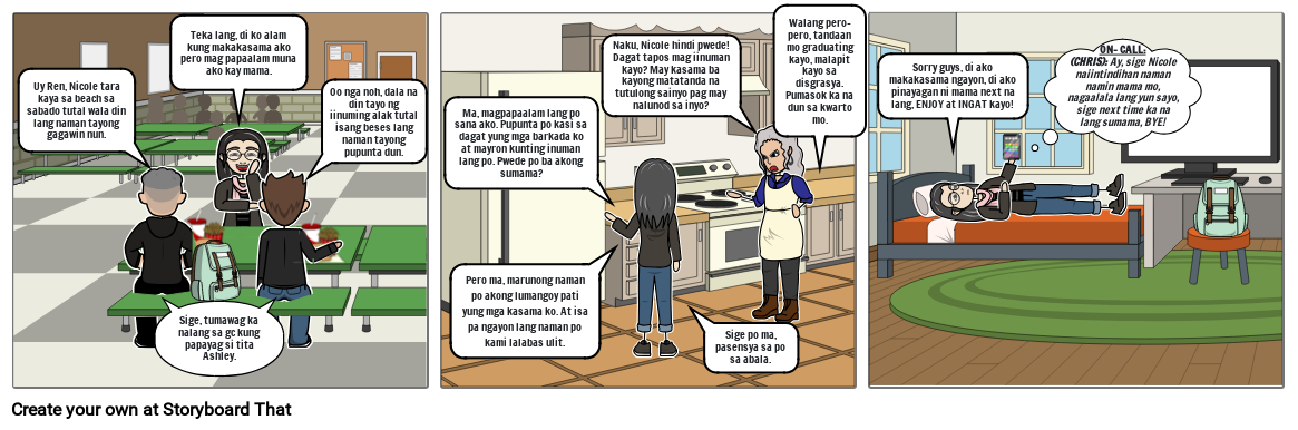 ON- CALL:(CHRIS): Ay, sige Nicole naiintindihan naman namin mama mo, nagaalala lang yun sayo, sige next time ka na lang sumama, BYE!