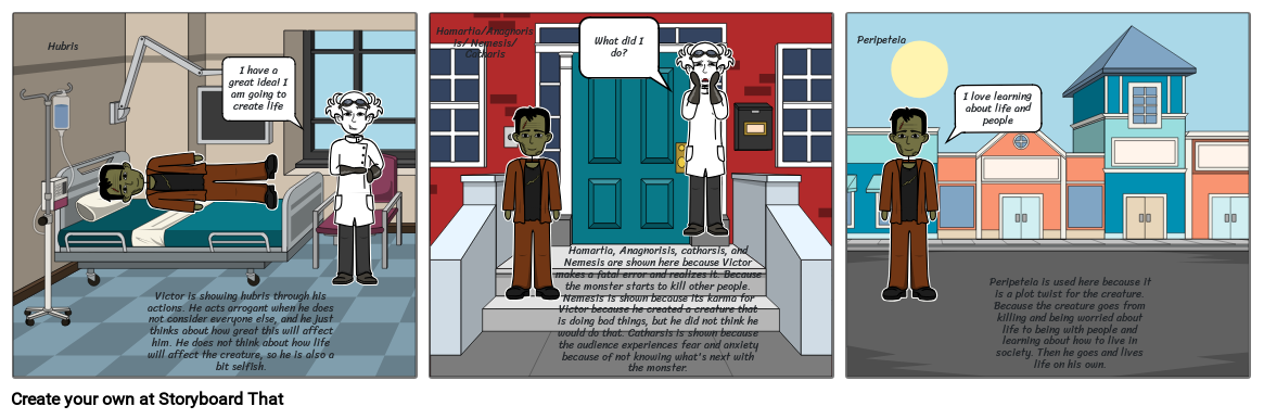Hamartia, Anagnorisis, catharsis, and Nemesis are shown here because Victor makes a fatal error and realizes it. Because the monster starts to kill other people. Nemesis is shown because its karma for Victor because he created a creature that is doing bad things, but he did not think he would do that. Catharsis is shown because the audience experiences fear and anxiety because of not knowing what's next with the monster.