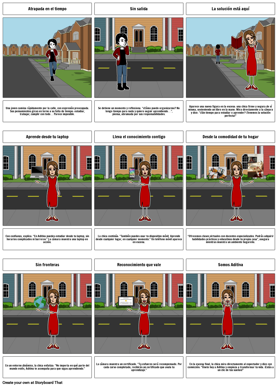 En la escena final, la chica mira directamente al espectador y dice con convicción: “Únete hoy a Aditiva y empieza a transformar tu vida. ¡Estás a un clic de tus sueños!”