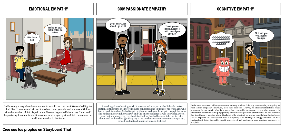 inthe Sesame Street video you can see Murray and Mark happy because they aregoing to talk about empathy, however, it is not easy for Murray to clearlyunderstand what empathy is, so Mark, who is a cognitive empathic person,perceives that Murray is frustrated and tries to help by putting his skillsinto practice pretend that he has stubbed his toe, Murray worries about Markand tells him that he knows exactly how he feels, so Mark explains to Murraythat this is empathy and Murray is happy because he has understood, but… hereally hasn't understood yet and mark uses another example to explain.