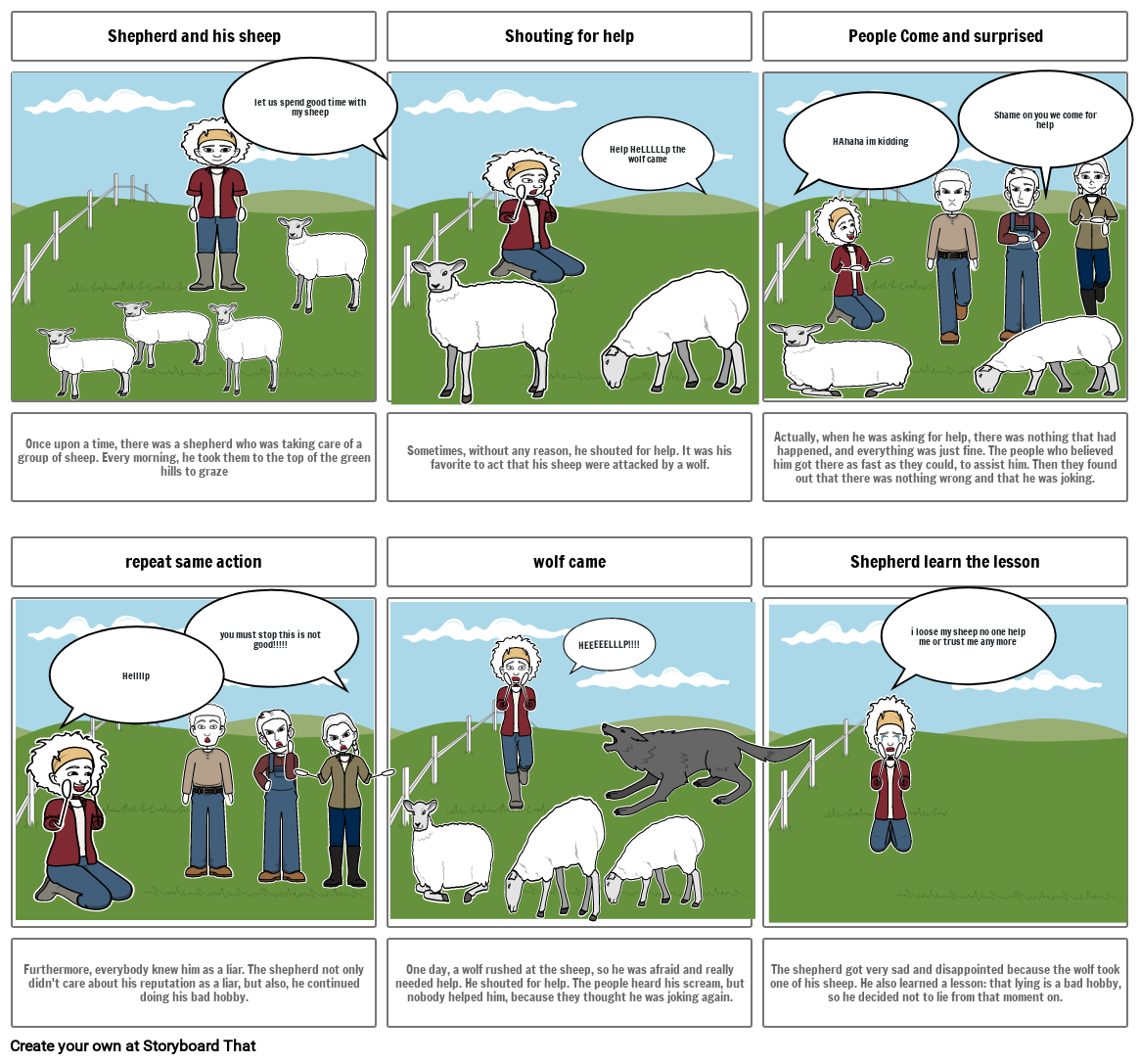 Sometimes, without any reason, he shouted for help. It was his favorite to act that his sheep were attacked by a wolf.