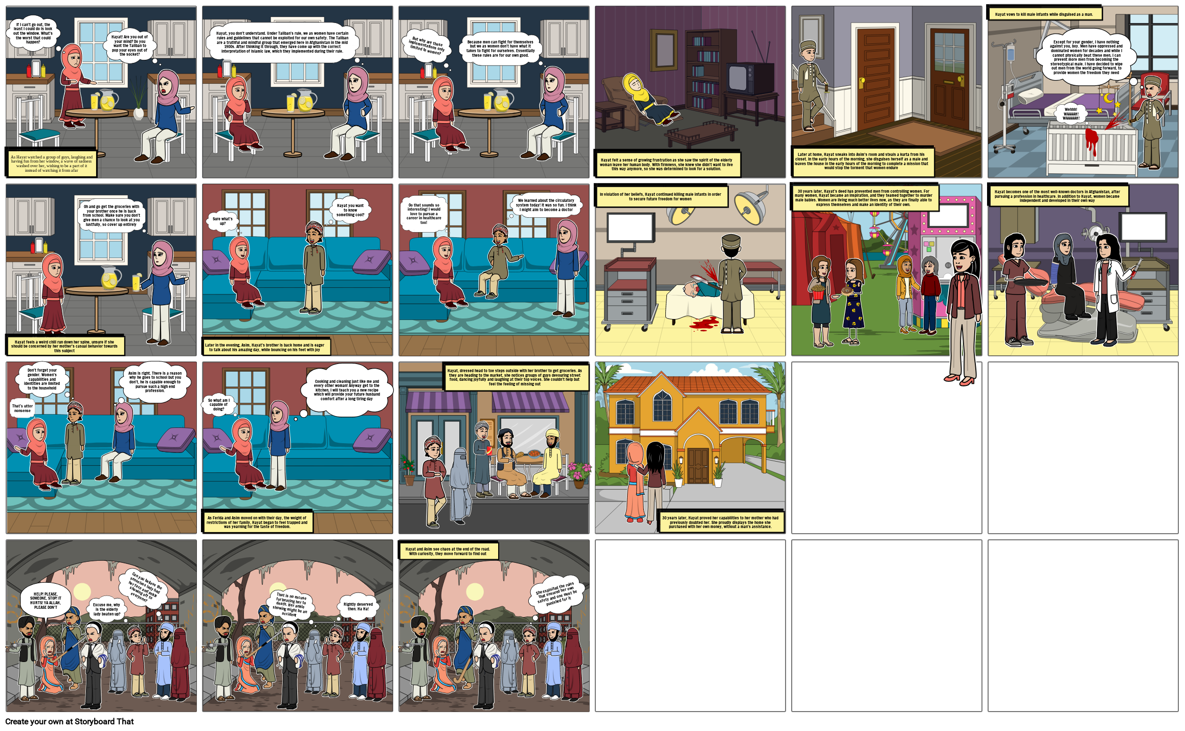 Hayat, you don’t understand. Under Taliban’s rule, we as women have certain rules and guidelines that cannot be exploited for our own safety. The Taliban are a truthful and mindful group that emerged here in Afghanistan in the mid 1900s. After thinking it through, they have come up with the correct interpretation of Islamic law, which they implemented during their rule.