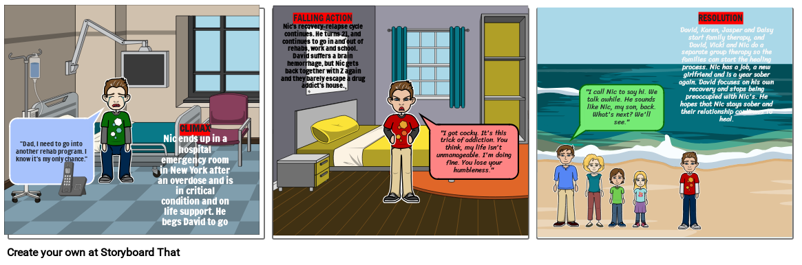 David, Karen, Jasper and Daisy start family therapy, and David, Vicki and Nic do a separate group therapy so the families can start the healing process. Nic has a job, a new girlfriend and is a year sober again. David focuses on his own recovery and stops being preoccupied with Nic's. He hopes that Nic stays sober and their relationship continues to heal.