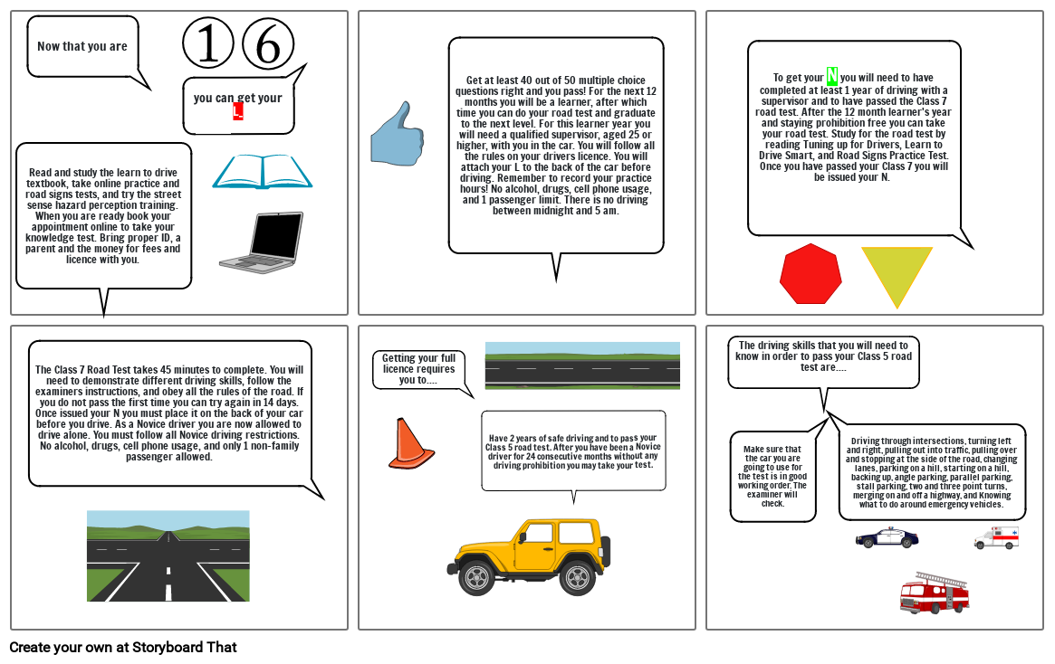 Get at least 40 out of 50 multiple choice questions right and you pass! For the next 12 months you will be a learner, after which time you can do your road test and graduate to the next level. For this learner year you will need a qualified supervisor, aged 25 or higher, with you in the car. You will follow all the rules on your drivers licence. You will attach your L to the back of the car before driving. Remember to record your practice hours! No alcohol, drugs, cell phone usage, and 1 passenger limit. There is no driving between midnight and 5 am.