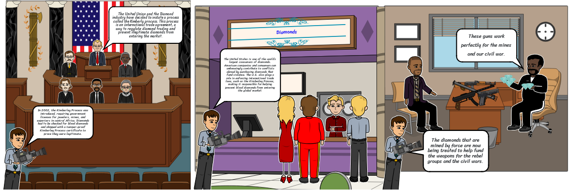 The United Union and the Diamond industry have decided to instate a process called the Kimberly process. This process is an International trade agreement, a way to regulate diamond trading and prevent illegitimate diamonds from entering the market.