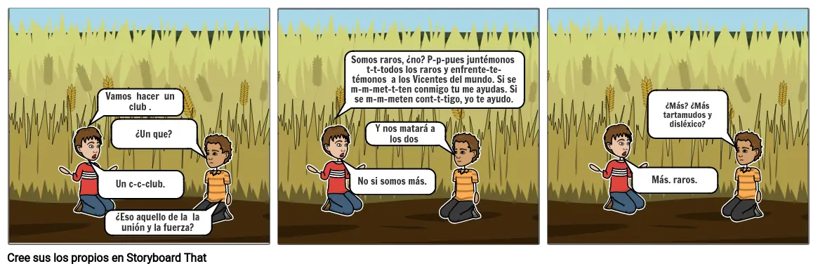 Somos raros, ¿no? P-p-pues juntémonos t-t-todos los raros y enfrente-te-témonos a los Vicentes del mundo. Si se m-m-met-t-ten conmigo tu me ayudas. Si se m-m-meten cont-t-tigo, yo te ayudo.