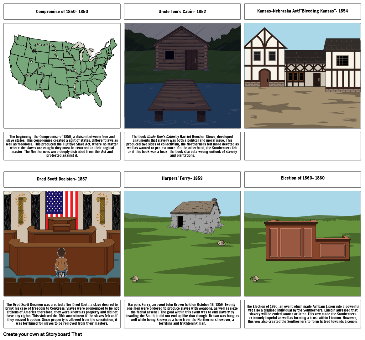 The beginning, the Compromise of 1850, a divison between free and slave states. This compromise created a split of states, different laws as well as freedoms. This produced the Fugitive Slave Act, where no matter where the slaves are caught they must be returned to their orginal master. The Northerners were deeply distrubed from this Act and protested against it.