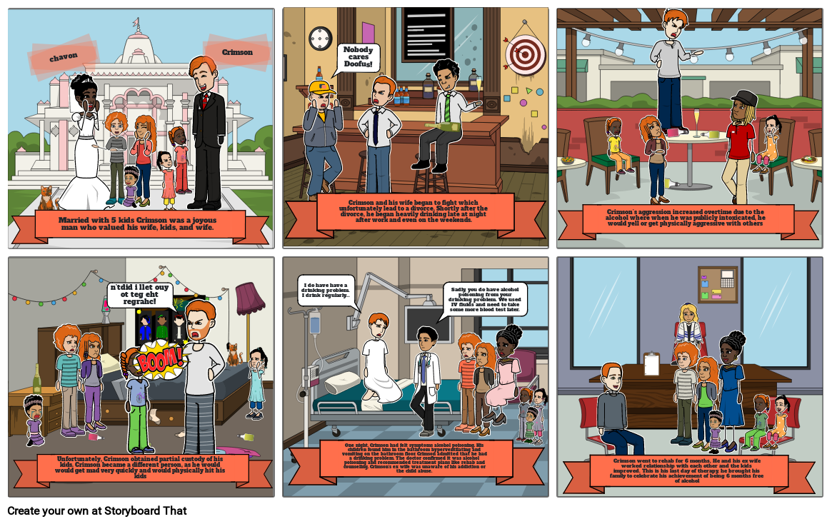 One night, Crimson had felt symptoms alcohol poisoning. His children found him in the bathroom hyperventilating and vomiting on the bathroom floor. Crimson admitted that he had a drinking problem. The doctor confirmed it was alcohol poisoning and recommended treatment plans like rehab and counseling. Crimson's ex wife was unaware of his addiction or the child abuse.