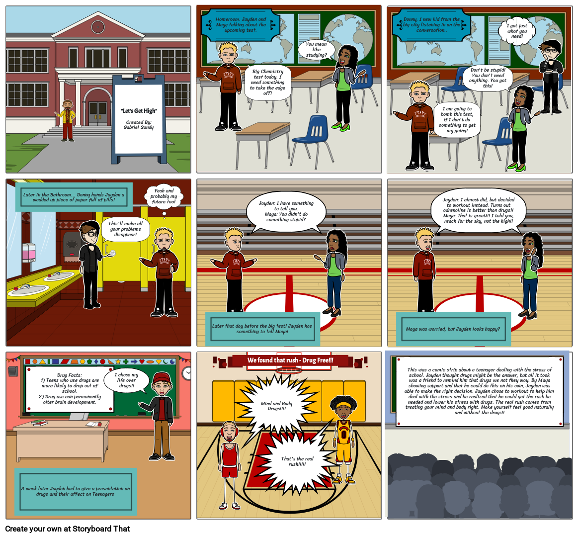 This was a comic strip about a teenager dealing with the stress of school. Jayden thought drugs might be the answer, but all it took was a friend to remind him that drugs we not they way. By Maya showing support and that he could do this on his own, Jayden was able to make the right decision. Jayden chose to workout to help him deal with the stress and he realized that he could get the rush he needed and lower his stress with drugs. The real rush comes from treating your mind and body right. Make yourself feel good naturally and without the drugs!!
