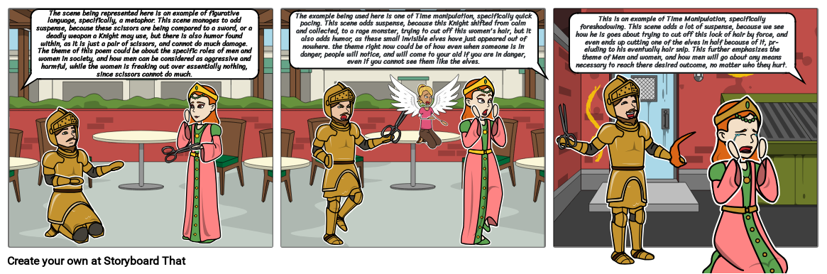 The scene being represented here is an example of figurative language, specifically, a metaphor. This scene manages to add suspense, because these scissors are being compared to a sword, or a deadly weapon a Knight may use, but there is also humor found within, as it is just a pair of scissors, and cannot do much damage. The theme of this poem could be about the specific roles of men and women in society, and how men can be considered as aggressive and harmful, while the women is freaking out over essentially nothing, since scissors cannot do much.