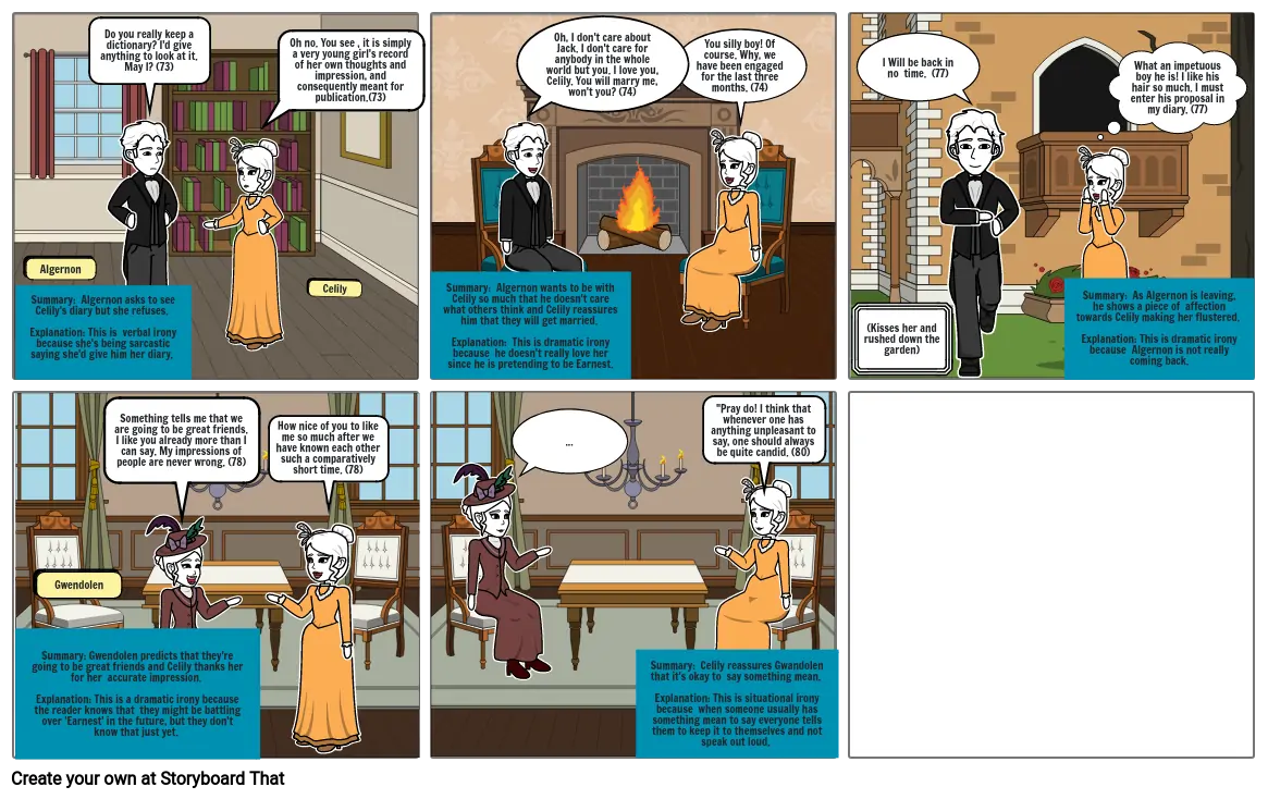 Summary: Gwendolen predicts that they're going to be great friends and Celily thanks her for her accurate impression. Explanation: This is a dramatic irony because the reader knows that they might be battling over 'Earnest' in the future, but they don't know that just yet.