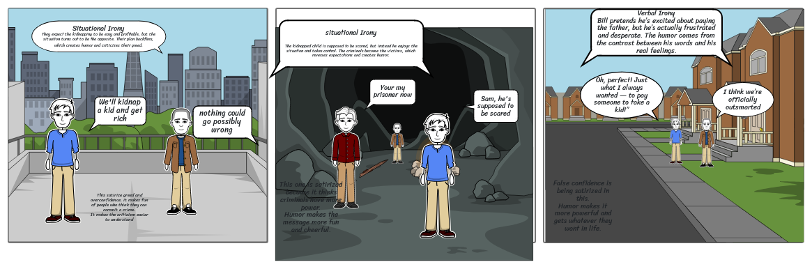 Situational IronyThey expect the kidnapping to be easy and profitable, but the situation turns out to be the opposite. Their plan backfires, which creates humor and criticizes their greed.