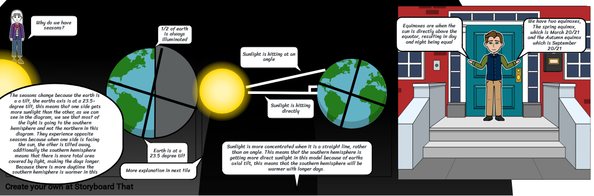 The seasons change because the earth is a a tilt, the earths axis is at a 23.5-degree tilt, this means that one side gets more sunlight than the other, as we can see in the diagram, we see that most of the light is going to the southern hemisphere and not the northern in this diagram. They experience opposite seasons because when one side is facing the sun, the other is tilted away, additionally the southern hemisphere means that there is more total area covered by light, making the days longer. Because there is more daytime the southern hemisphere is warmer in this set-up