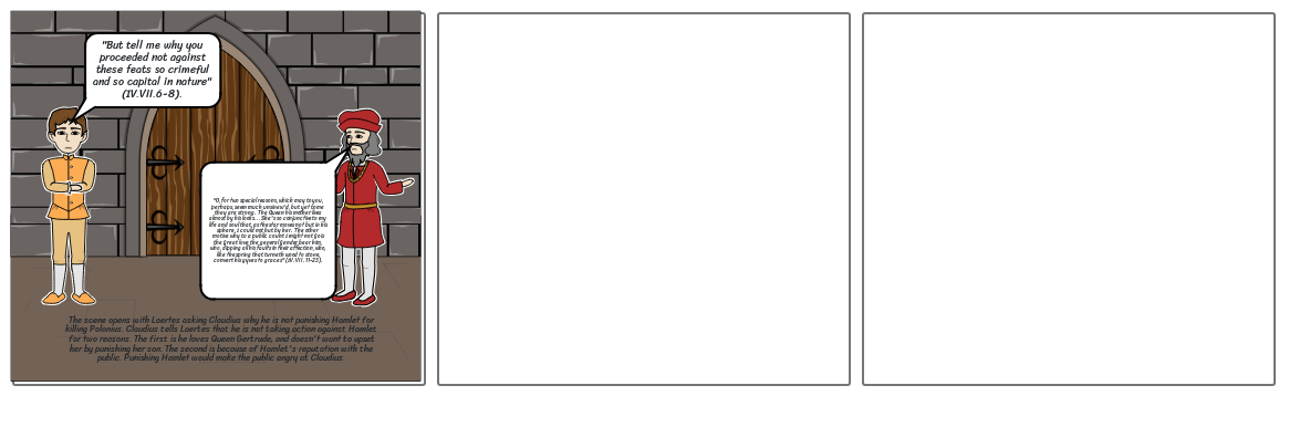 The scene opens with Laertes asking Claudius why he is not punishing Hamlet for killing Polonius. Claudius tells Laertes that he is not taking action against Hamlet for two reasons. The first is he loves Queen Gertrude, and doesn't want to upset her by punishing her son. The second is because of Hamlet's reputation with the public. Punishing Hamlet would make the public angry at Claudius.