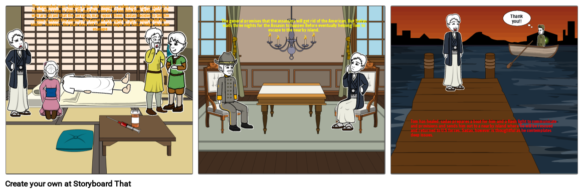 The general promises that the assassins will get rid of the American. But Sadao waits three nights for the Assasin to happen Before eventually helping Tom to escape to the nearby island.