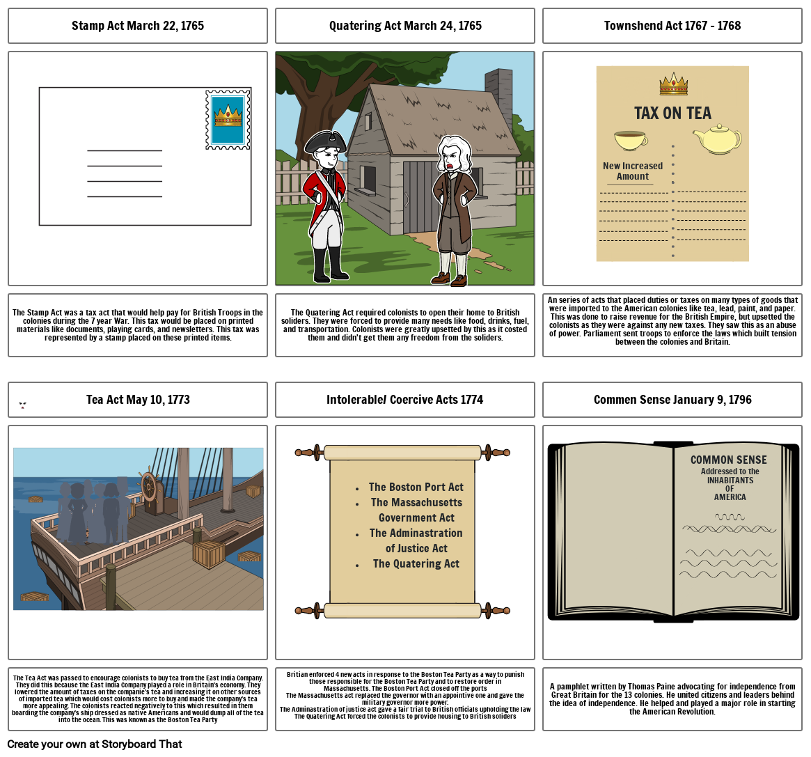 An series of acts that placed duties or taxes on many types of goods that were imported to the American colonies like tea, lead, paint, and paper. This was done to raise revenue for the British Empire, but upsetted the colonists as they were against any new taxes. They saw this as an abuse of power. Parliament sent troops to enforce the laws which built tension between the colonies and Britain.