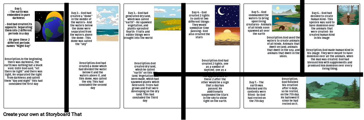 Day 1:- The earth was embedded in pure darkness- God had created its opposite. Separating them into 2 different periods in a day- He gave these 2 different periods names ''Night Day''