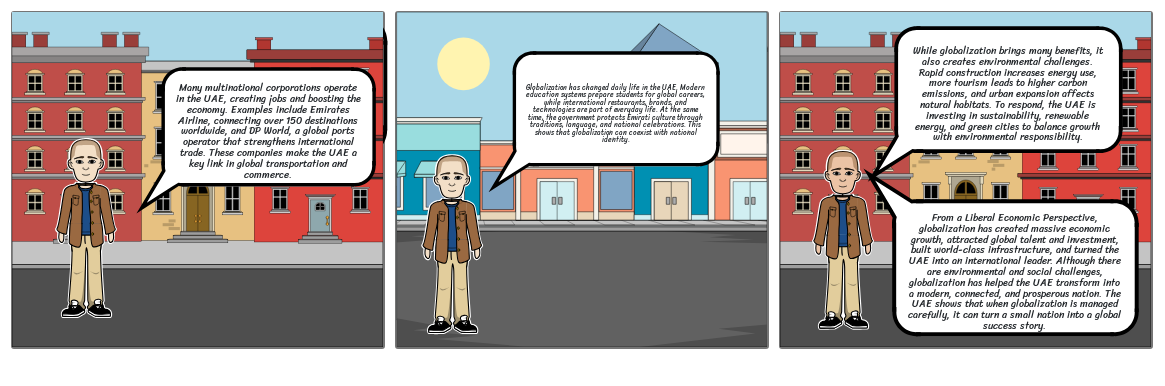 Globalization has changed daily life in the UAE. Modern education systems prepare students for global careers, while international restaurants, brands, and technologies are part of everyday life. At the same time, the government protects Emirati culture through traditions, language, and national celebrations. This shows that globalization can coexist with national identity.