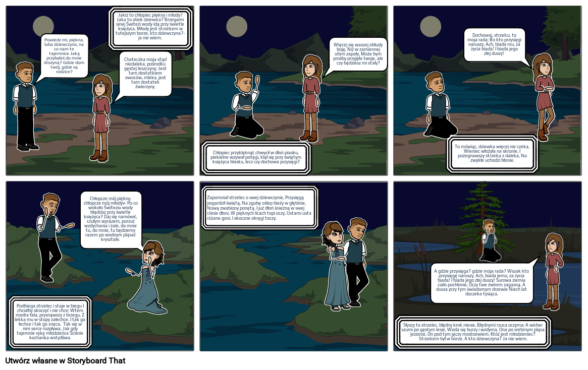 Jakiż to chłopiec piękny i młody? Jaka to obok dziewica? Brzegami sinej Świtezi wody idą przy świetle księżyca. Młody jest strzelcem w tutejszym borze, kto dziewczyna?- ja nie wiem.