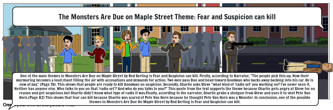 One of the main themes in Monsters Are Due on Maple Street by Rod Serling is Fear and Suspicion can kill. Firstly, according to Narrator, "The people pick this up. Now their murmuring becomes a loud chant filling the air with accusations and demands for action. Two men pass Don and head toward Goodman who backs away backing into his car. He is now at bay." (Page 76). This shows that people are ready to kill Goodman on suspicion. Secondly, Charlie asks Steve "what kind of 'radio set' you working on? I've never seen it, Neither has anyone else. Who talks to you on that 'radio set'? And who do you talks to you?" This quote from the text supports the theme because Charlie gets angry at Steve for no reason and get suspicious but Charlie didn't know what type of radio it was.Finally, according to the narrator, Charlie grabs a shotgun from Steve and uses it to shot Pete Van Horn.(Page 82) This shows that fear can kill because Charlie was scared of Pete Van Horn because he thought Pete Van Horn was a Monster. In conclusion, one of the possible themes in Monsters Are Due On Maple Street by Rod Serling is Fear and Suspicion can kill.