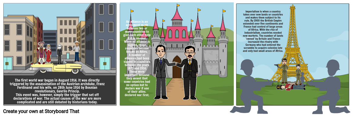 An alliance is an agreement made between two or more countries to give each other help if it is needed. When an alliance is signed, those countries become known as Allies.A number of alliances had been signed by countries between the years 1879 and 1914. These were important because they meant that some countries had no option but to declare war if one of their allies. declared war first.