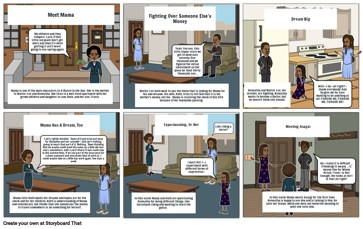 Mama tells Ruth wants her dreams and hopes are for the check and for her children. Ruth is understanding of Mama and considerate, but thinks that she should use the money to travel somewhere or do something for herself.