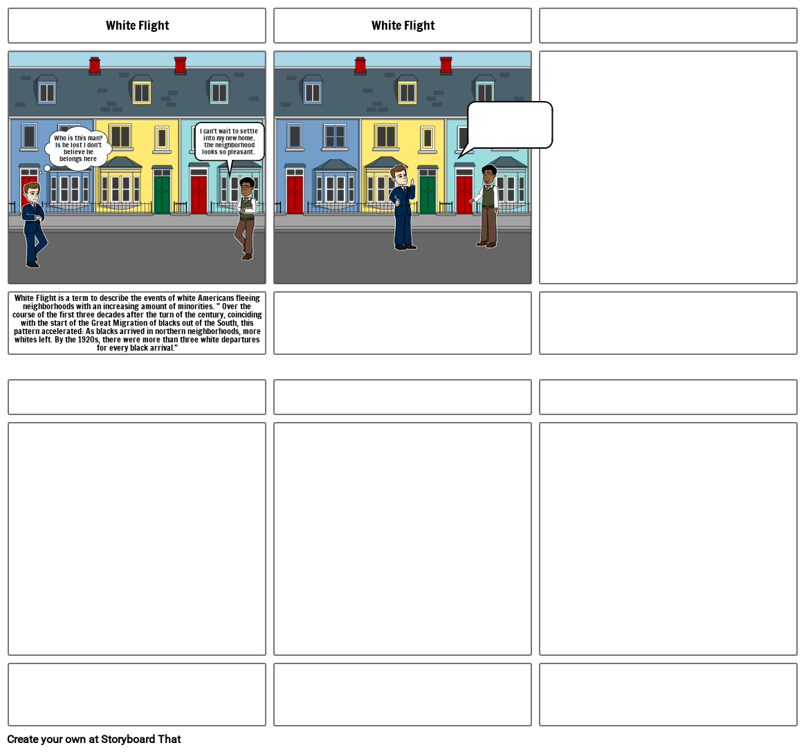 White Flight is a term to describe the events of white Americans fleeing neighborhoods with an increasing amount of minorities. " Over the course of the first three decades after the turn of the century, coinciding with the start of the Great Migration of blacks out of the South, this pattern accelerated: As blacks arrived in northern neighborhoods, more whites left. By the 1920s, there were more than three white departures for every black arrival."