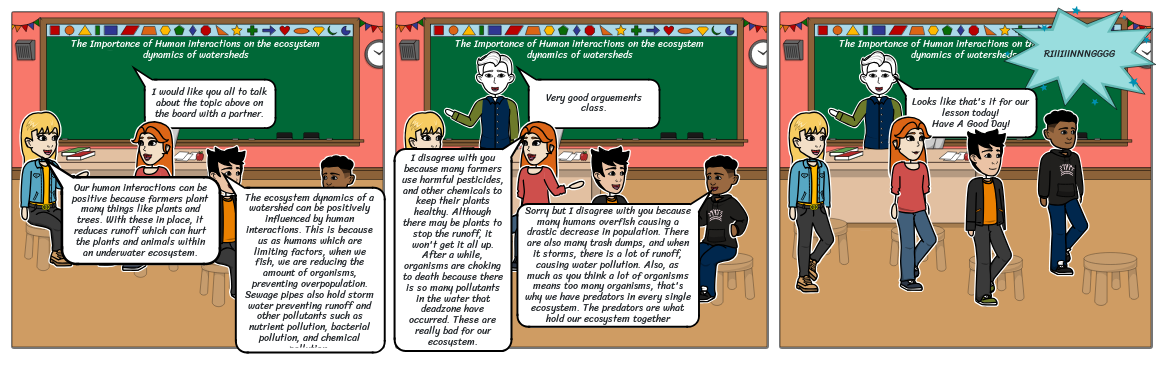 Sorry but I disagree with you because many humans overfish causing a drastic decrease in population. There are also many trash dumps, and when it storms, there is a lot of runoff, causing water pollution. Also, as much as you think a lot of organisms means too many organisms, that's why we have predators in every single ecosystem. The predators are what hold our ecosystem together